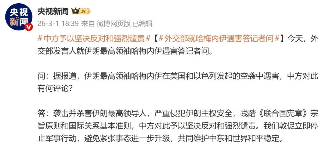 3月1日,据央视新闻消息:今天,外交部发言人就伊朗最高领袖哈梅内伊遇害答记者问。