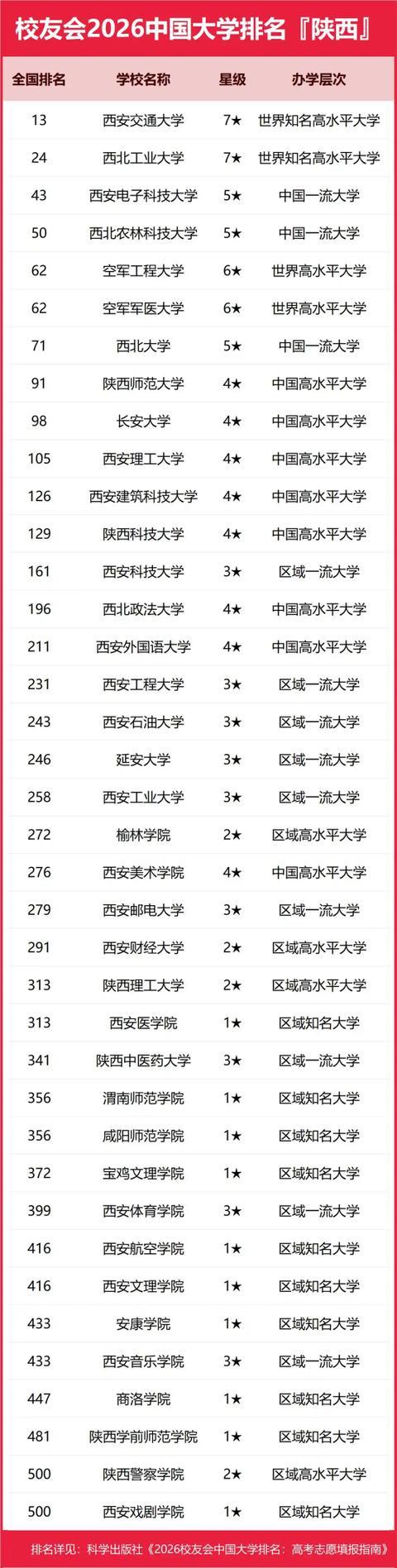 西安交通大学依然稳居省内第一。该校在全国总排位是第13名,评分最高为7星,是世界顶级大学。这样的评级结果是对西安交大长期综合实力的肯定。学校历史悠久,在理工科领域有着非常深厚的基础,其能源、电气、机械等学科在国内一直处于领先地位。学校不但承担了很多前沿的科研任务,而且为国家重大工程输送了大量的关键人才。它稳固的排名位置,是它坚实的基础和长久的影响所形成的。
